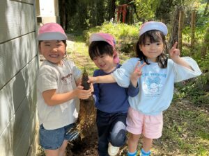 普段なかなか触れることの少ない土の感触に驚いたり、「ここにありそう!」「かたいね」と友だちと声を掛け合いながら、一生懸命に探したり、掘ったりする姿が見られました。なかなか抜けないたけのこにも粘り強く向き合い、掘り上げたときには大きな達成感と喜びを感じている様子でした。