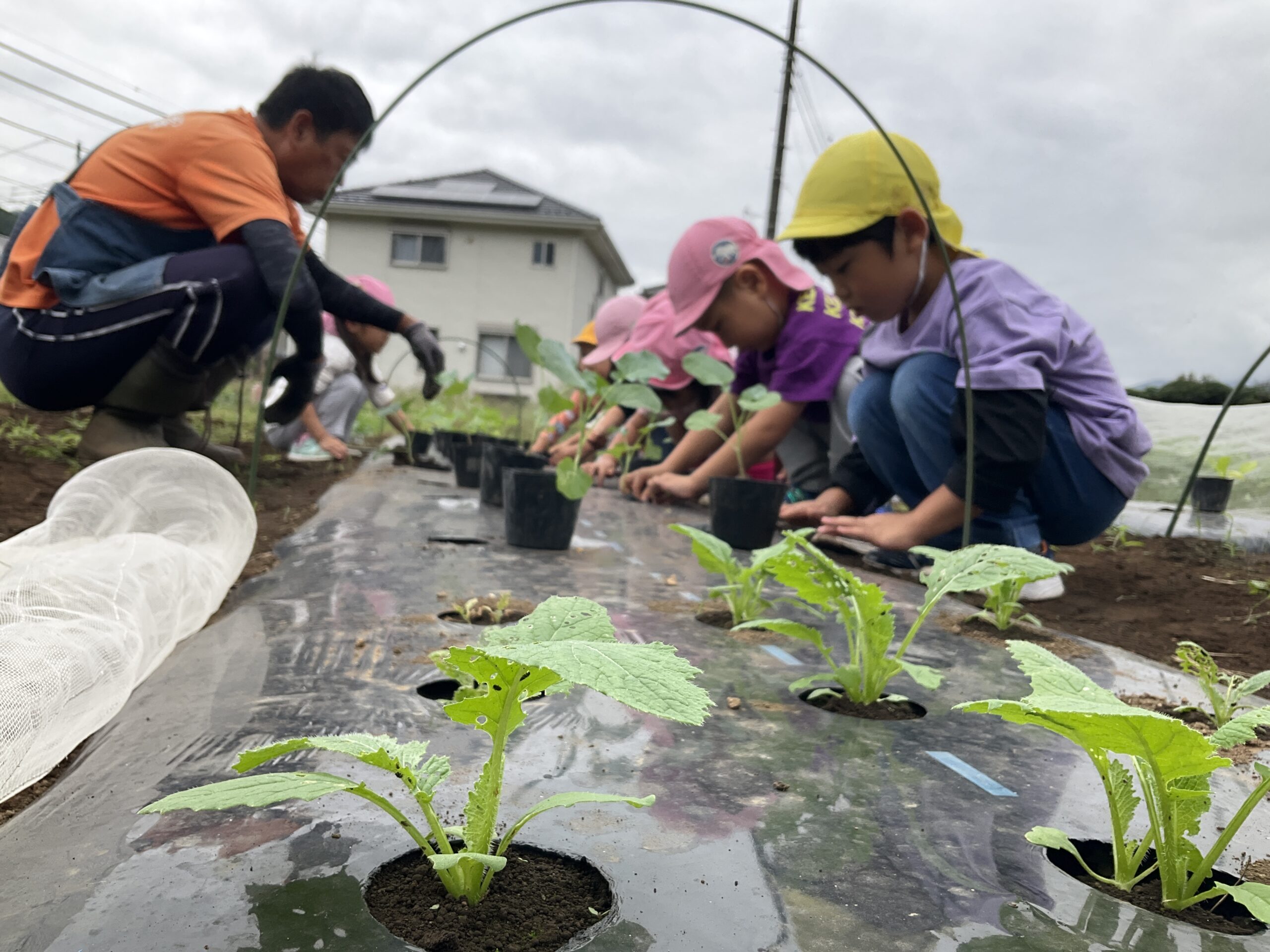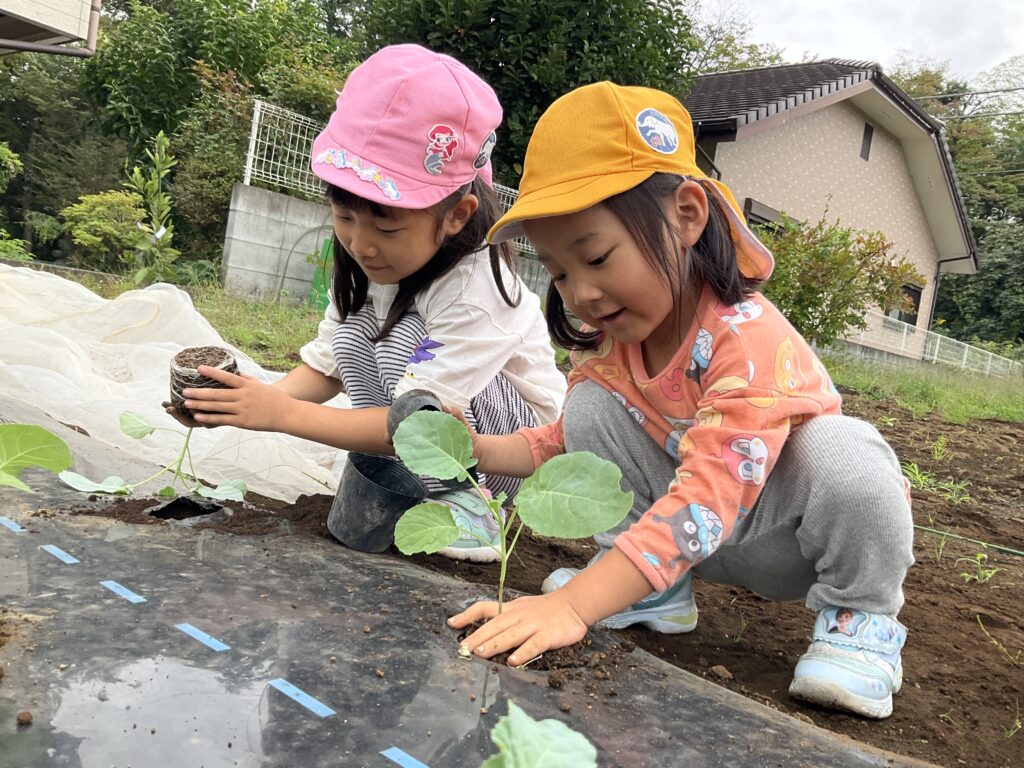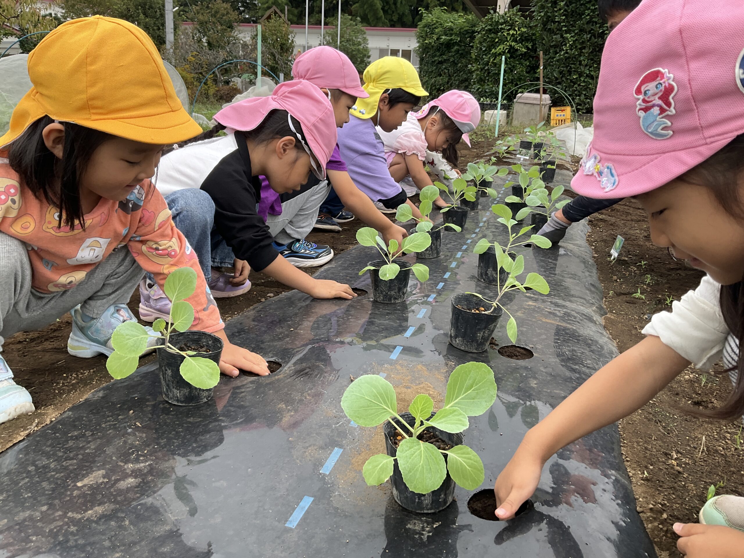 今日はみんなで畑に出て、ブロッコリー・キャベツ・白菜の苗を植えました!小さな苗を手に取って、「これがブロッコリーになるの!?」「やさしく土のおふとんかけてあげよう!」と興味津々^ ^
