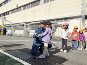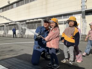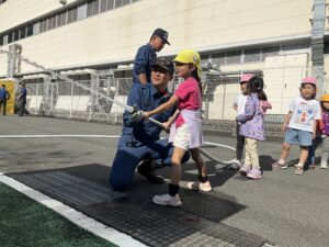 最初は少し緊張した様子の子どもたちでしたが、消防士さんが「大丈夫だよ」「こうやってやるんだよ」と優しく声をかけてくれると、次第に表情が和らぎ、興味津々な様子で活動に参加していました。