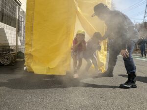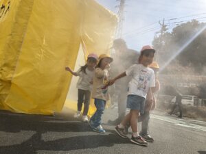 また、煙体験では「前が見えないね」「ハンカチで口をおさえるんだって」と、実際に身体を使って避難の方法を学ぶ姿も見られました。