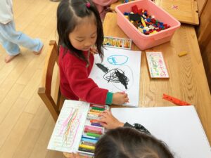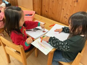 自由画帳を広げて、和組の2人が顔を見合わせながら楽しそうに絵を描いていました。「これみて!」「おもしろいね」と言葉を交わし、笑い合う姿が見られました。自分の思いやイメージを表現する楽しさだけでなく、友達と共有する喜びも感じている様子でした。関わりの中で気持ちを伝え合い、一緒に遊びを深めていく姿に、4歳児ならではの豊かな育ちが感じられますね。