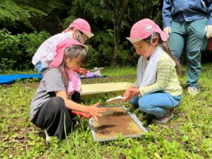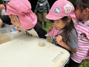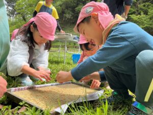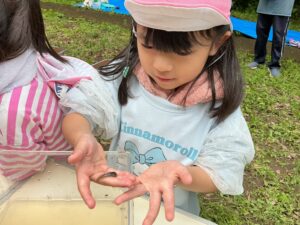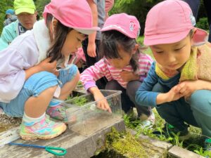 実際に捕まえて触れ合う中で、生き物の動きや大きさの違いに気づいたり、「ここに隠れてるよ」と友だちと発見を共有していました。