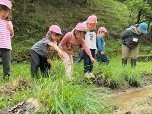 田んぼの水路ではオタマジャクシやザリガニの赤ちゃんを見つけ、「いた!」「ちっちゃくてかわいい!」と大興奮。